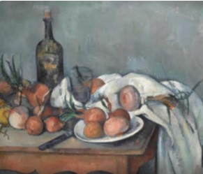 Llamado a menudo el padre del arte moderno Paul Cézanne creó un nuevo enfoque pictórico que se convertiría en la inspiración del cubismo y de otros importantes movimientos artísticos del siglo XX. Aunque Cézanne elaboró naturalezas muertas desde el comienzo de su carrera hasta que no se desvinculó del impresionismo. Estás no cobraron una especial relevancia en su obra. En esta pintura se explora la firme forma esférica de las cebollas y del plato frente al arrugado tejido blanco de la parte posterior. Junto a estos elementos también hay una botella un vaso y una navaja. Por aquel entonces Cézanne había dejado de pintar los efectos superficiales de la luz, el color y lo que intentaba era captar las estructuras geométricas subyacentes de los objetos y ello sin adherirse a la perspectiva lineal tradicional de uno o dos puntos la cual consideraba innecesarias. Estaba buscando una forma de representación completamente nueva que fuera más analítica. Cézanne creía que la forma más honesta de abordar la pintura del mundo tridimensional en superficies planas pasaba por mostrar los objetos desde varios ángulos a la vez lo cual se parece más a la forma en la que enfocaba el ojo humano, hacer visibles las pinceladas con lo que el espectador toma conciencia de la transformación del Lienzo. Este nuevo sistema de representación queda expuesto en esta pintura en la que los objetos están pintados desde varios puntos de vista, lo cual puede apreciarse en la inclinación de las cebollas sobre la mesa y en la descripción de la botella así como en la forma en la que se percibe dicha mesa desde un lateral y a la vez se presenta desde arriba con todo para mantener la ilusión de profundidad. El cuchillo está colocado en ángulo, su enfoque y sus exploraciones inspiraron el desarrollo del cubismo en el siglo 20.