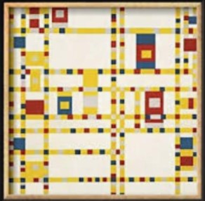Mondrian empleo varios años en simplificar la pintura al máximo a fin de reflejar su percepción de la energía que hay en el equilibrio de fuerzas por las que se rigen la naturaleza y el universo. Esto le llevó a reducir todas las descripciones del mundo a colores primarios y elementos verticales y horizontales los cuales representan las fuerzas opuestas elementales de lo positivo y de lo negativo de lo Dinámico y de lo estático de lo masculino y de lo femenino. A este estilo pictórico los llamó neoplasticismo huyendo de una Europa devastada por la guerra en 1940 fue a New York su primera noche conoció el Boogie Woogie de Broadway. Como respuesta realizó esta pintura reflejo de la disposición de Manhattan en la que surgieron las calles el tráfico las luces eléctricas y el jazz...dejando a un lado las habituales líneas negras que separan zonas de color y empleo cuadrados de color, para realizar el diseño creando una nueva energía directamente inspirada en la vitalidad descubierta en Nueva York . La distribución de los cuadrados de brillantes colores dentro de las líneas amarillas transmiten los distintos ritmos vitales de la bullente ciudad y los minúsculos bloques dan lugar a un ritmo Dinámico una vibración óptica que sugiere movimiento.