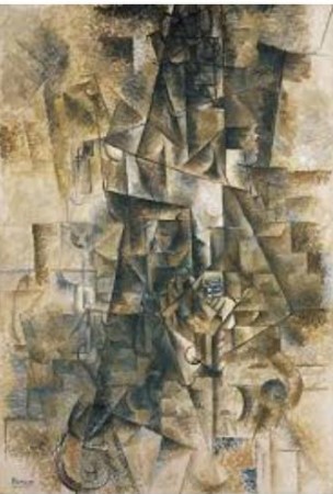 Picasso el artista más célebre del siglo 20 fue un innovador, pintor, dibujante, escultor y ceramista. Cambió el x curso del arte gracias a los numerosos estilos que adoptó. En 1911 se encontraba pintando con George Braque, intercambiaron ideas sobre la fragmentación de los objetos y el uso de gama de colores restringidas para representar formas tridimensionales sobre dos dimensiones. Este estilo se llamó cubismo analítico aunque esta pintura representa un hombre tocando un acordeón, la descomposición de los ángulos y las superficies y la gama casi monocromática lo descomponen hasta llegar casi a la abstracción. El espectador como es natural busca pistas entre las apretadas figuras geométricas pistas que Picasso proporciona en la mitad superior. La masa de figuras curvas conforma el rostro del acordeonista abajo sobre sale un gran ángulo recto qué es el brazo del músico. La forma en la que está flexionado sugiere que tiene el brazo apoyado en una silla y cerca de la firma de Picasso abajo a la izquierda hay una forma curva que sugiere la base de la pata de una silla, mientras que en otro lado hay una forma similar que insinúa la otra pata.